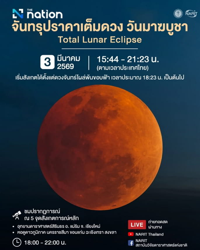 Le soir même, la Thaïlande assistera à un phénomène rare : une éclipse lunaire totale. La Lune apparaîtra rouge brique dès son lever à l’est.