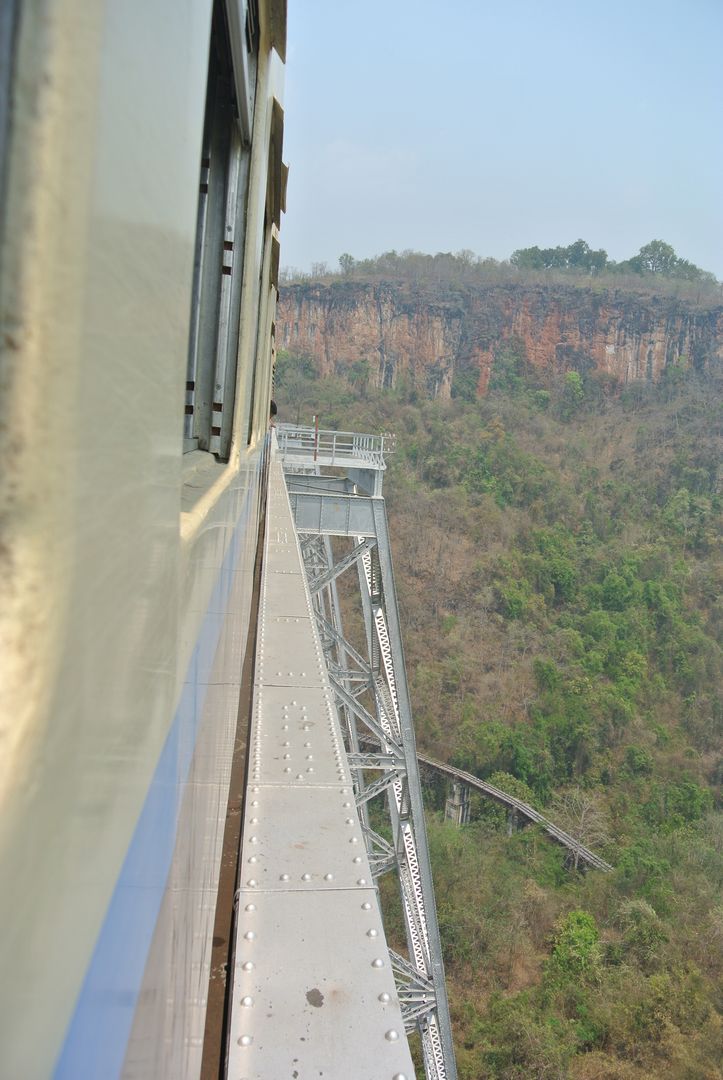 Le viaduc n’est pas de toute première jeunesse. Construit en 1901 par la Pennsylvania Steel Company, il semble fragile. Pourtant, à vitesse réduite, le train s’engage. Le vacarme métallique est saisissant : métal contre métal, craquements du pont, couinement d’un train lui aussi digne de l’empire colonial britannique victorien. On peut alors se dire que de nombreuses restaurations ont été faites dans les années 1990 et que de telles constructions peuvent subir aisément les dommages du temps, du climat et des moussons successives. Mais rapidement, l’appréhension est balayée par la splendeur du paysage, par les couleurs des falaises et du spectacle général qui se déroule autour de soi.