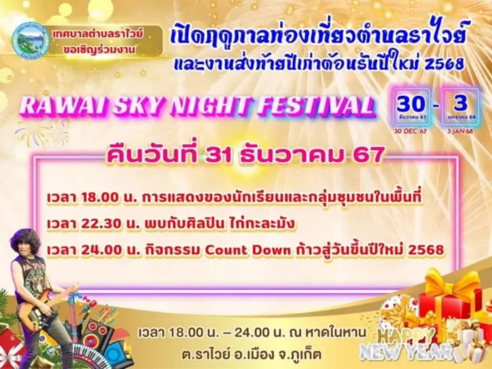 Phuket organise chaque année plusieurs événements publics pour le réveillon. Entre concerts, feux d’artifice et animations en bord de mer, l’île propose des célébrations réparties sur ses principales plages, accessibles gratuitement.